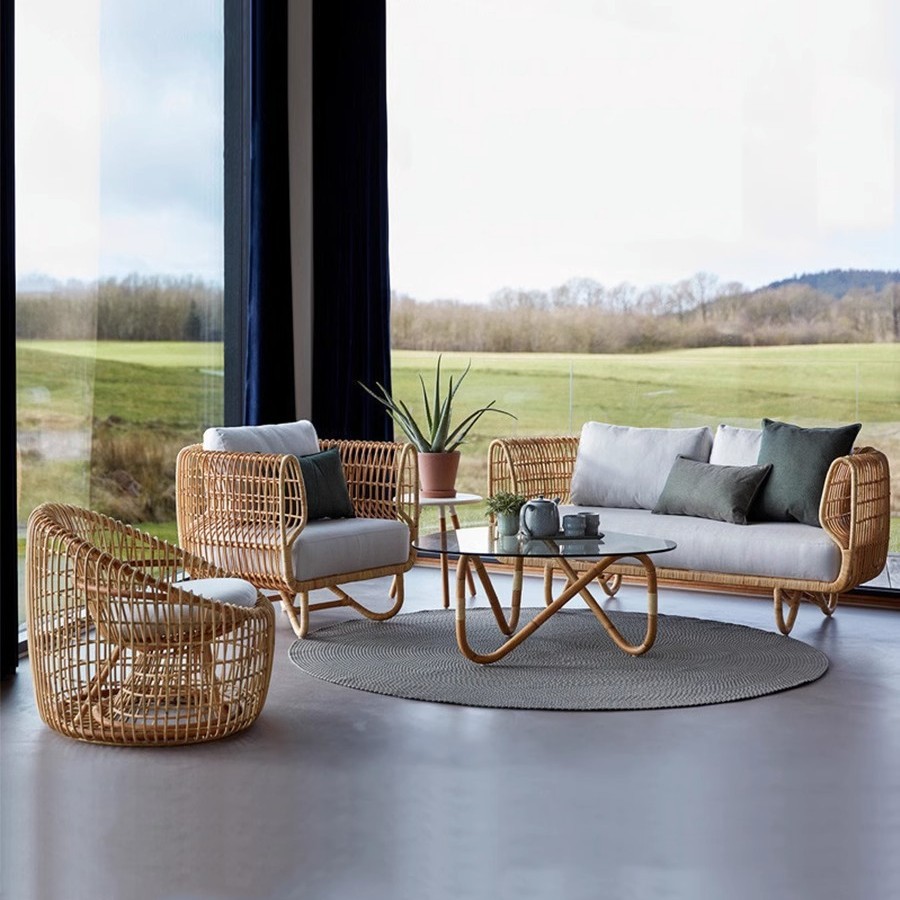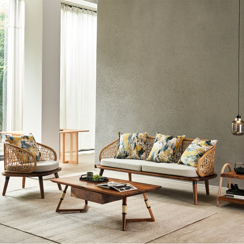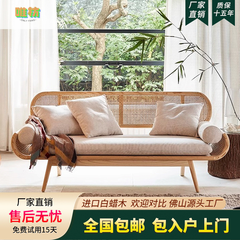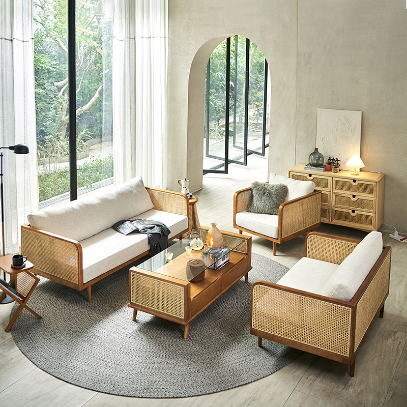 北欧風藤編ソファーセット別荘民宿客間室内家庭用原木色二人三人ネット赤藤椅子