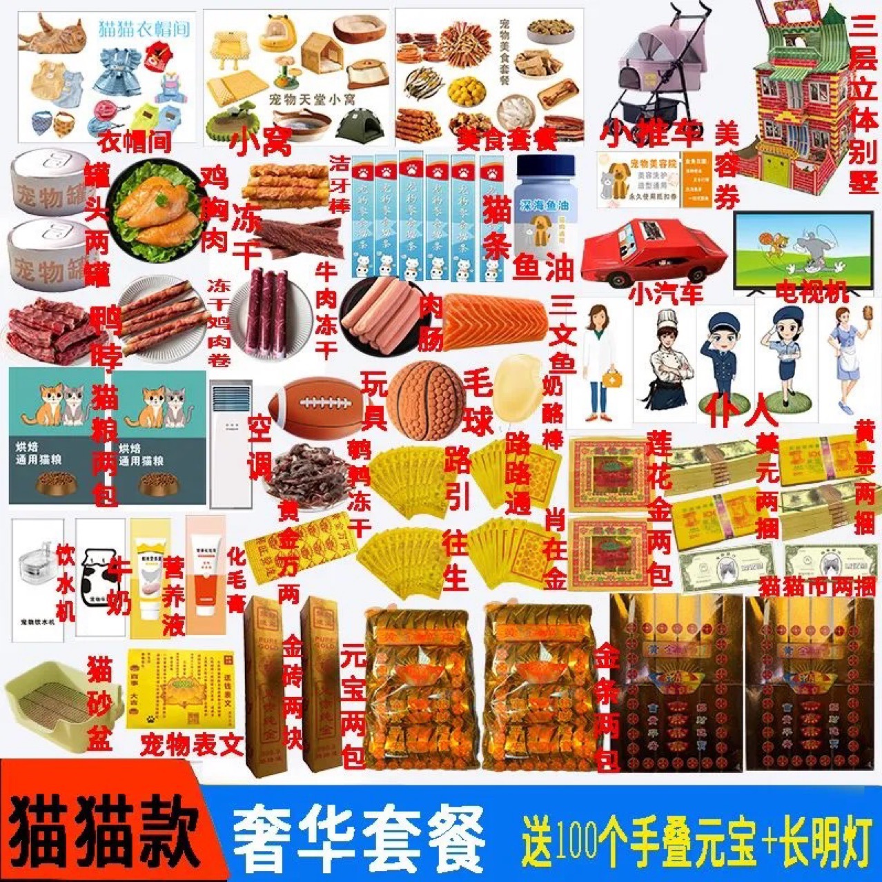 ペット紙幣、葬儀用品、猫と犬の葬儀、紙の焼却、追悼、七つの供物、模擬スナック