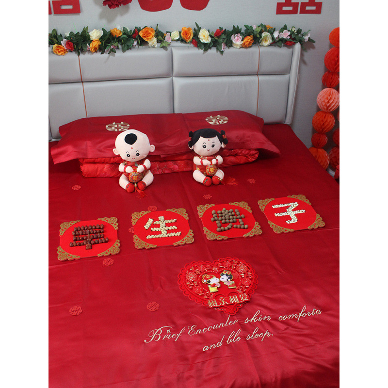新婚ベッド人形、新婚夫婦、新しい高級結婚式ルーム、黄金の少年と少女、赤い結婚式の人形、ハッピーな言葉の枕