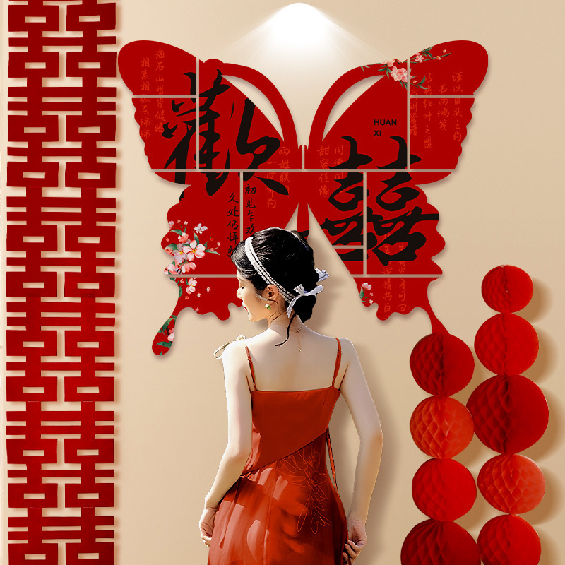 結婚式の部屋のレイアウト結婚式の蝶の装飾背景壁ハイエンド女性と男性の寝室のベッドサイドの壁の写真セット