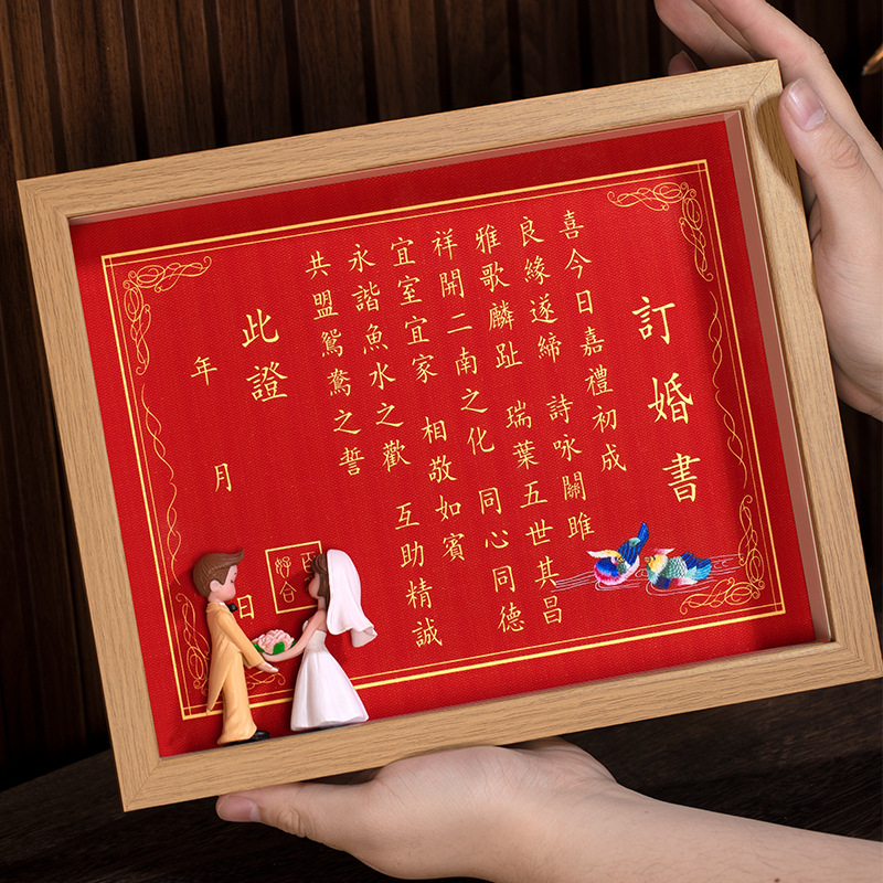 結婚婚約書は新婚客間のフォトフレームを飾って寝室のベッドの頭の棚を飾ってお祝いします。