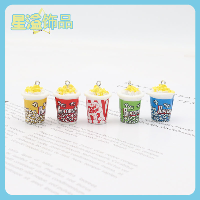 樹脂シミュレーションシール付きカラーバケツ入り黄色ポップコーン微景観キーホルダー携帯ストラップ