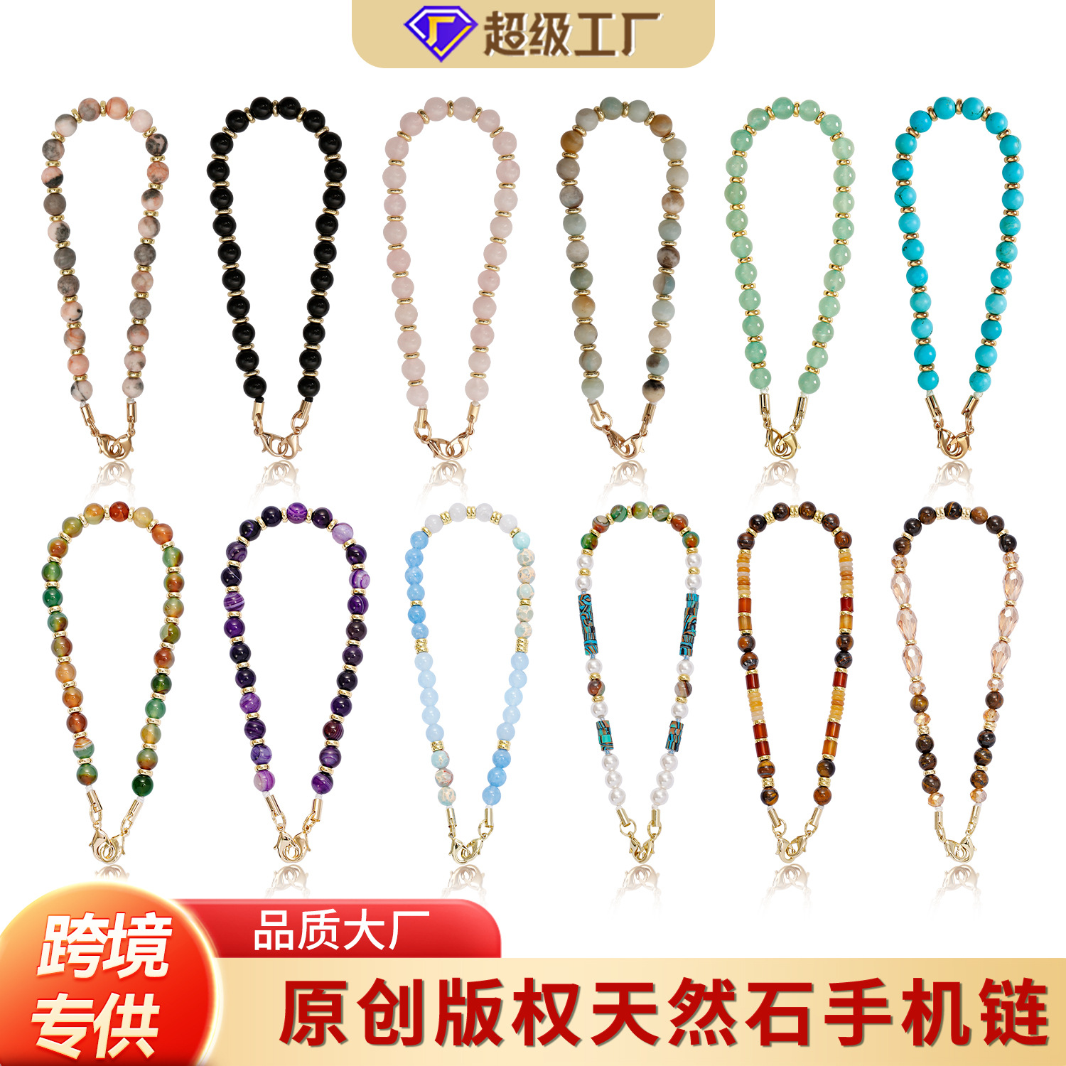 国境を越えた人気のビーズ携帯電話チェーンアマゾナイトアメジスト黒曜石高品質携帯電話ストラップ天然原石