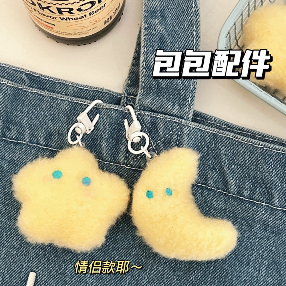 かわいい毛のふわふわしたミルクの黄色の星の月は少女のリュックサックのキーホルダーを掛けます。