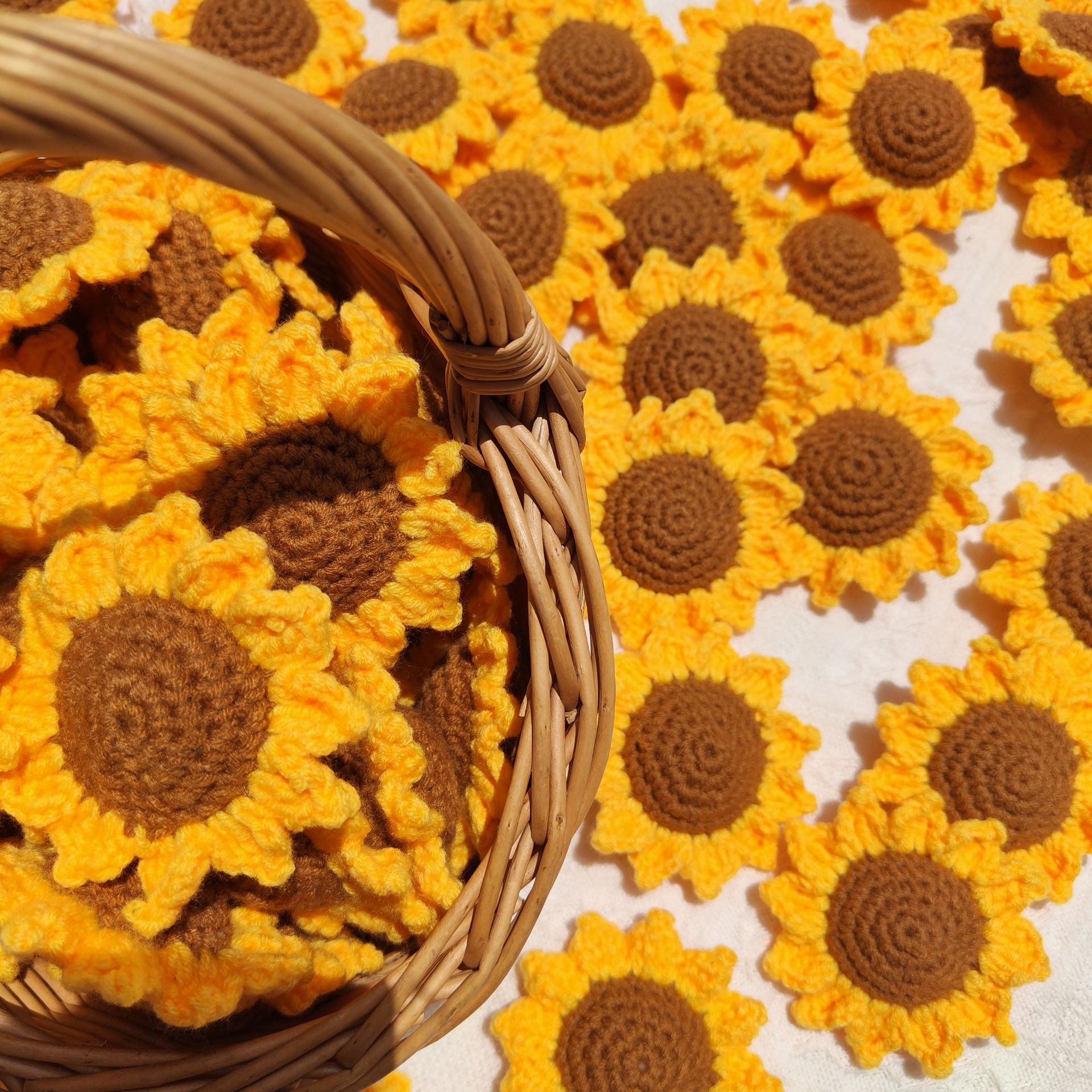 手作りのヒマワリの花の頭のかぎ針編みの完成品のニットの太陽の花の半製品のヒマワリの花束