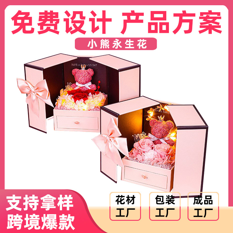 七夕節の小さなクマのプリザーブドフラワーギフトボックス、両開きのバラの花ネックレスジュエリーボックス、クリスマスプレゼント、口紅ギフトボックス