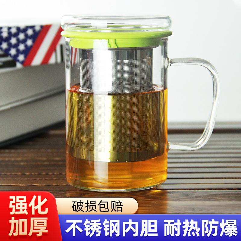 茶水分離泡カップ蓋付きハンドルステンレス茶漏れフィルタを厚くした高透ガラスカップ