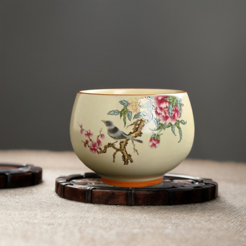 喜上眉梢米黄汝窯銅銭主杯陶器茶器家庭用汝磁茶杯品茶杯茶器ギフト