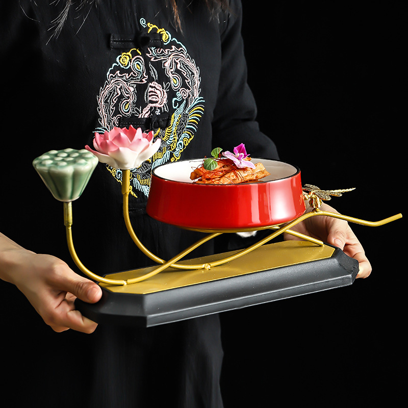ホテルの特色の冷たい料理の陶磁器の食器のアイデアの鉄芸の蓮の花の明段は皿の冷たい料理のレストランの会の新しい中国式を並べます。