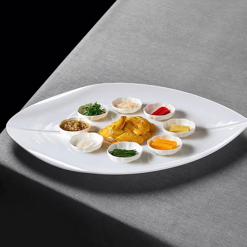 個性的な陶磁器の白い楕円形の木の葉の皿のホテルは冷たい料理の皿の異形の食事の皿の高級感の創意の食器を使います。