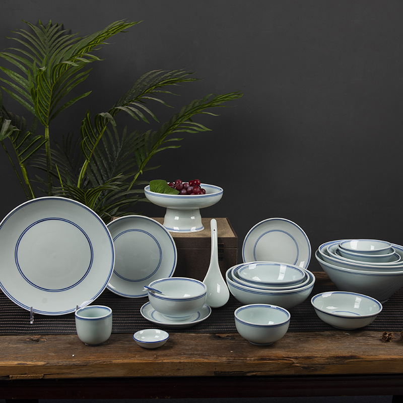 景徳鎮の陶磁器の食器の新しい中国式の置物の影の青釉のホテルのレストランの皿の碗のセットの火鍋の店の碗の皿