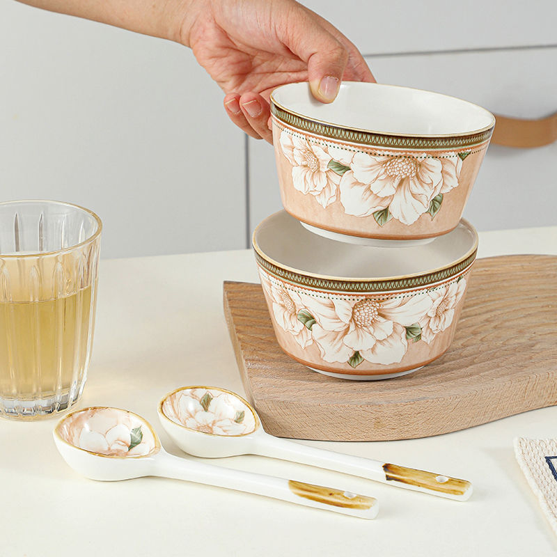 ネットセレブ高見え椿陶器食器 2 ボウル 2 スプーン火傷防止滑り止め釉下色新築祝いボウルとスプーンの組み合わせ食器