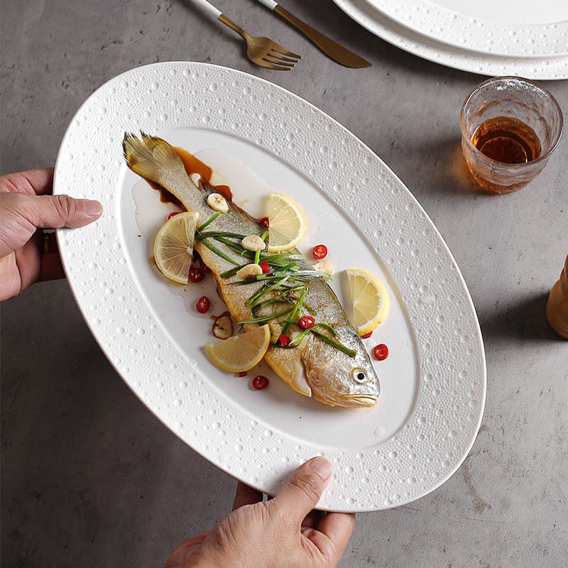 陶磁器の魚の皿の特大サイズの16インチの白い平盤のホテルのレストランの商用は皿の私房の料理の食器を並べて砂をつぶします。