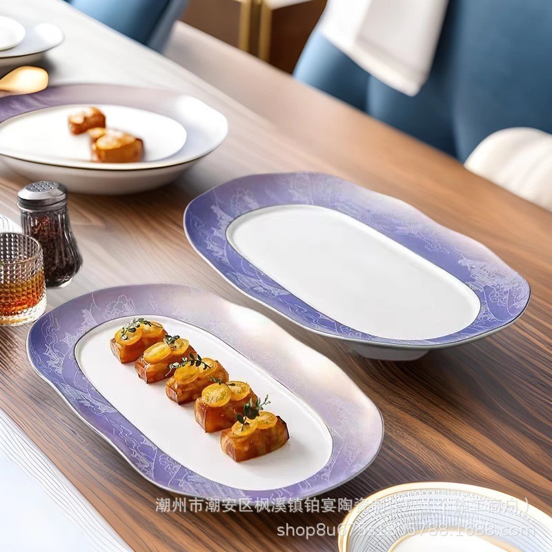 新中国式陶磁器楕円幅青いグラデーション魚皿創意料理皿清明上河図皿境地料理食器