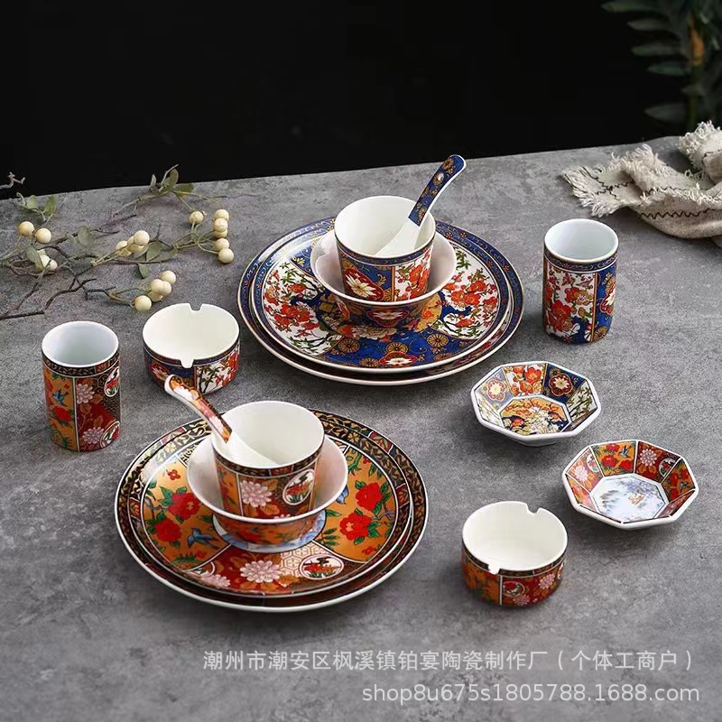レトロなテーブルの食器の4つのセットの日本式の陶磁器のセットの中国式の特色の碗の皿のホテルのクラブハウスの境地の碗の皿