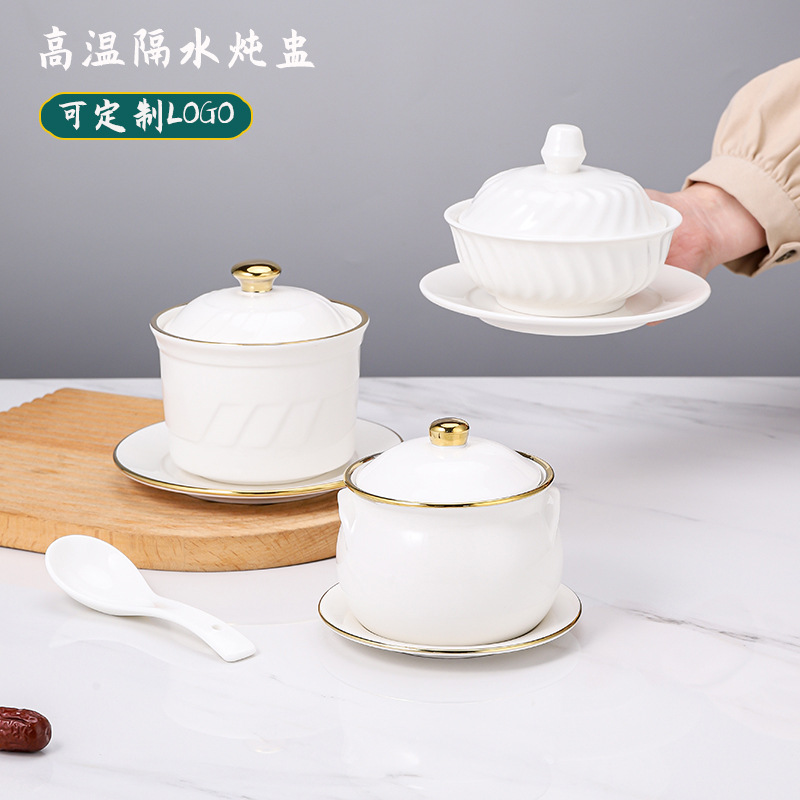 ホテルの陶磁器のヨーグルトの缶の新型のアイデアの二重のデザートのシチューの杯のレストランの特色のツバメの巣は水をあけて杯を煮ることを煮込んでいます。
