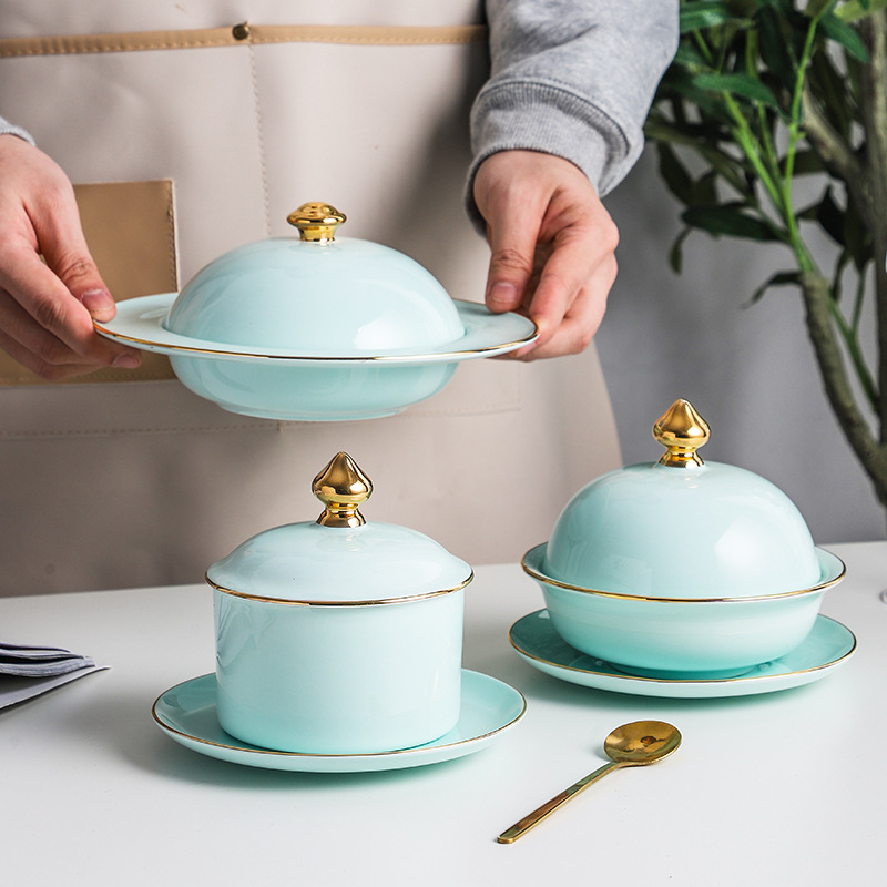 日本式陶磁器家庭用隔水シチューは蓋付きのスープを持っています。