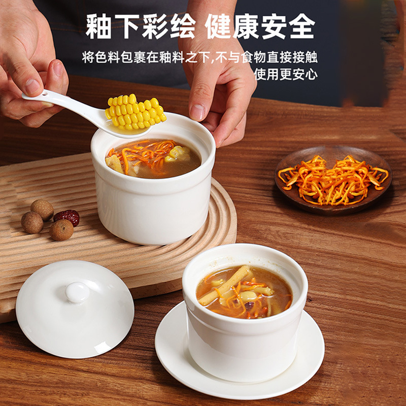 現物の5寸の泰式のシチューの商用スープの杯の陶磁器の蒸し卵の碗は蓋の小さいシチューの缶の白い磁器を持って水をあけてツバメの巣の杯を煮込んでいます。