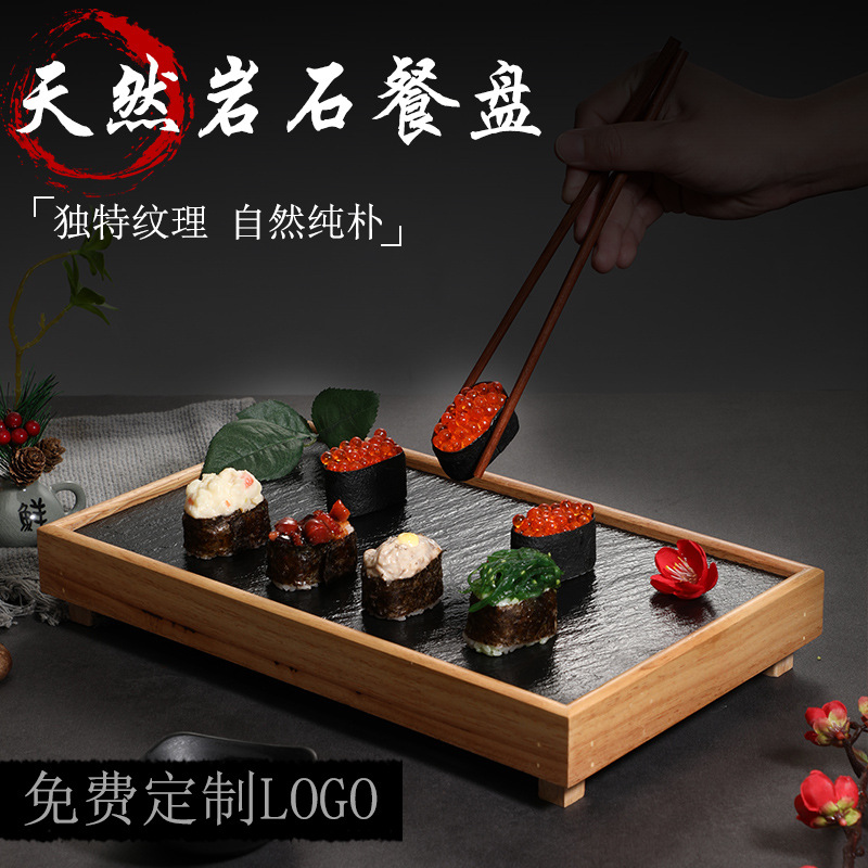 黒い岩の食事皿日本式寿司平盤レトロ原木創意石板食器角型石盤焼肉皿