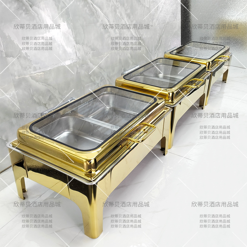 金色のステンレスのセルフサービスの食事炉の電気加熱の布菲炉の金メッキのアルコールの朝食炉のホテルの保温の鍋は業務用を備えます。