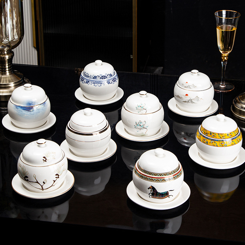 セラミックシチューポット、家庭用防水シチューポット、ホテル用品、食器、スープカップ、金縁シチューボウル、ツバメの巣カップ、ロゴを追加可能