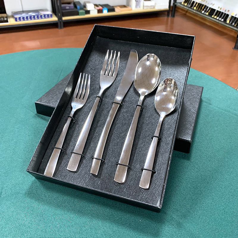 ステンレス製のナイフ・フォーク・スプーンセット、高級感のあるステーキナイフ、ディナーフォーク、ディナースプーン、サラダフォーク、ティースプーン、ギフトボックス入り5点セット