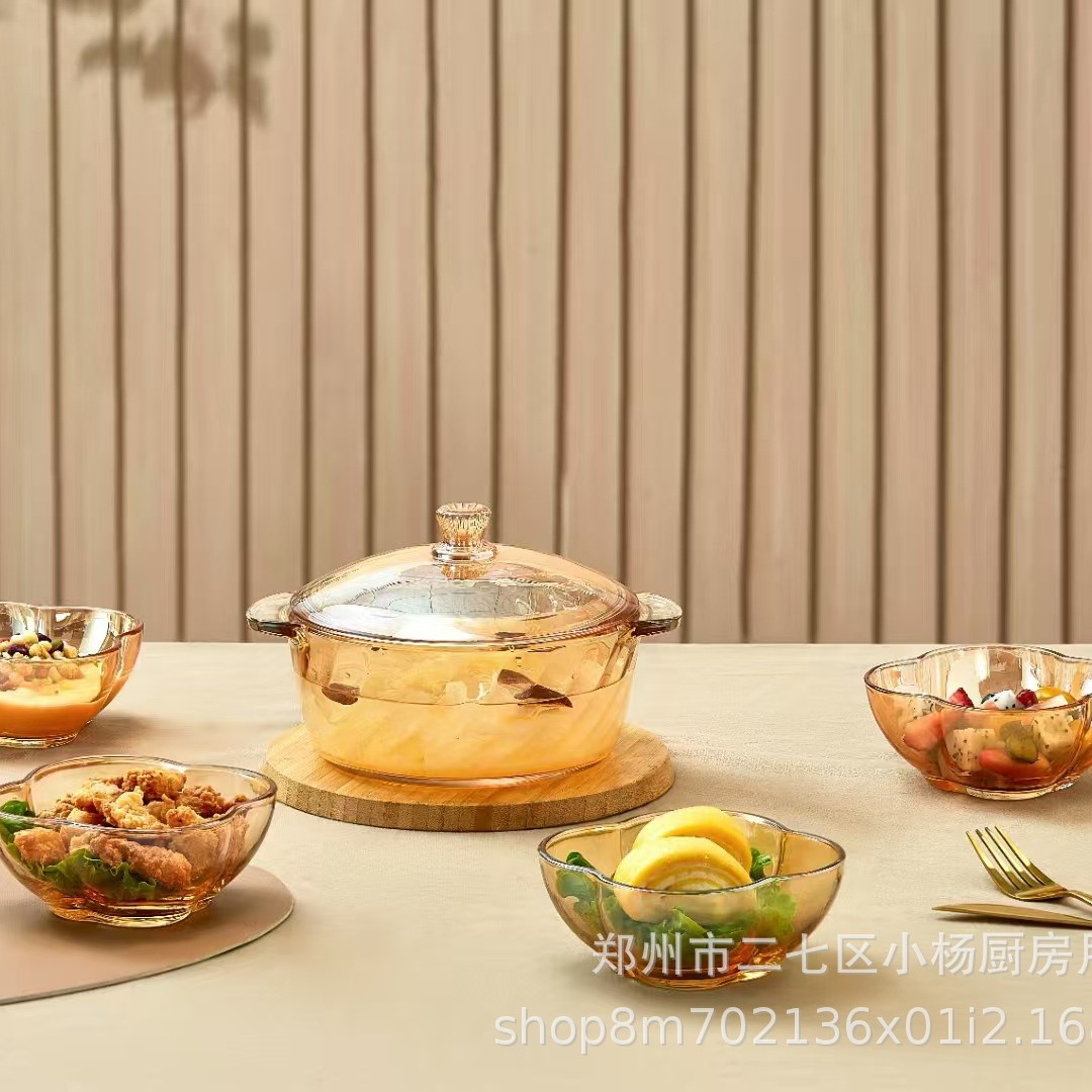 Weiyang 耐熱食器 アンバーガラスボウル 鍋食器 5点セット 家庭用花びら小鉢 蓋付き両耳