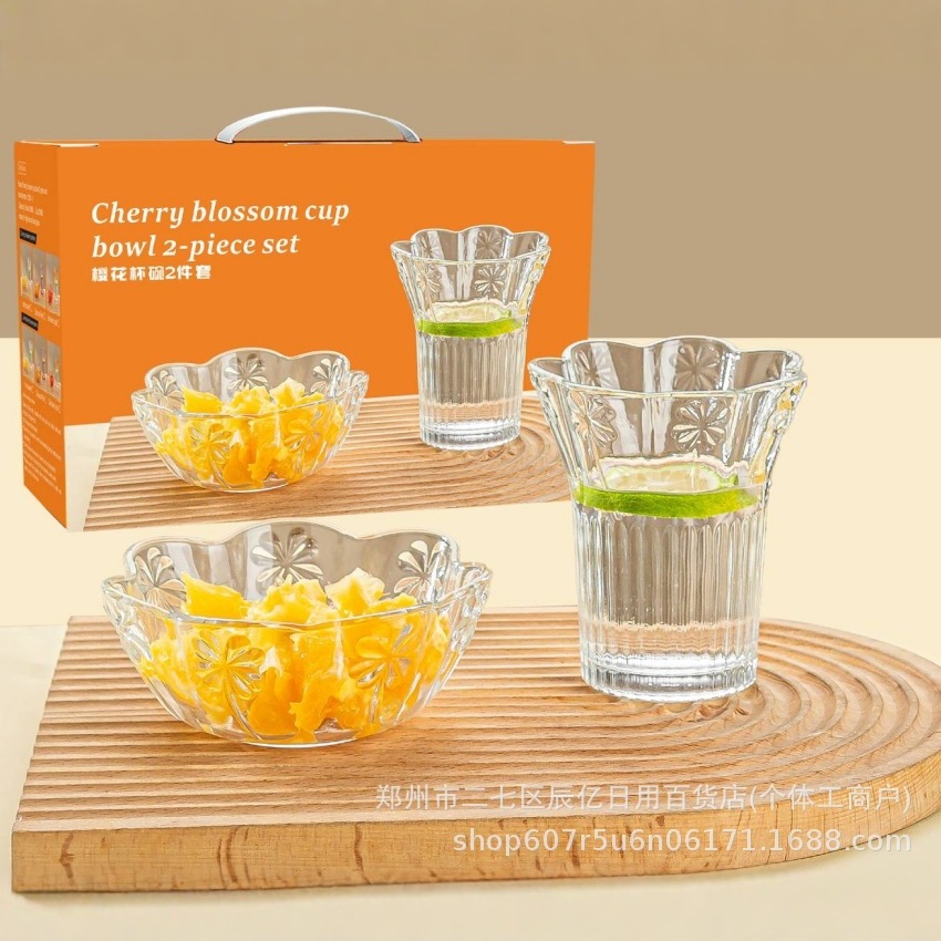 ガラス食器セット 2点セット ボウルとカップ シンプルな透明サラダボウル ジュースカップ ギフト 縦模様 家庭用カップとボウル