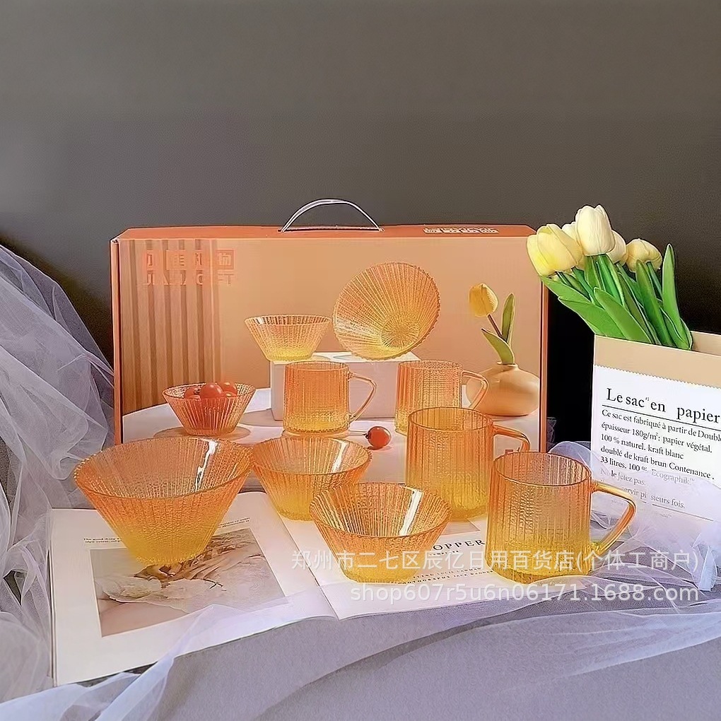 加佳プレゼント色ガラス食器セットシリーズ縦縞碗プレゼント会社販促セット