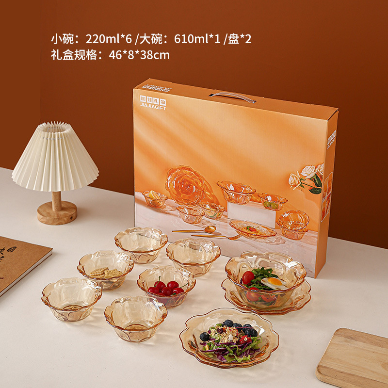 デロイト花開富貴二点セット創意グラスサラダ碗家庭用ガラス食器セットビジネスプレゼント