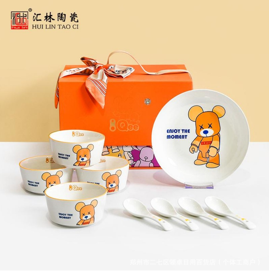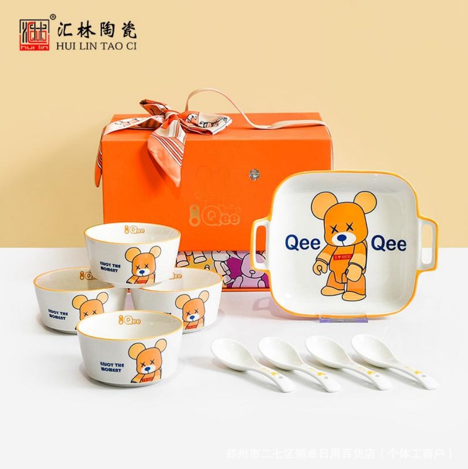 汇林陶磁器大橘は重暴力熊双耳飯皿陶磁器碗皿スプーン食器セットプレゼント箱にプレゼントします。