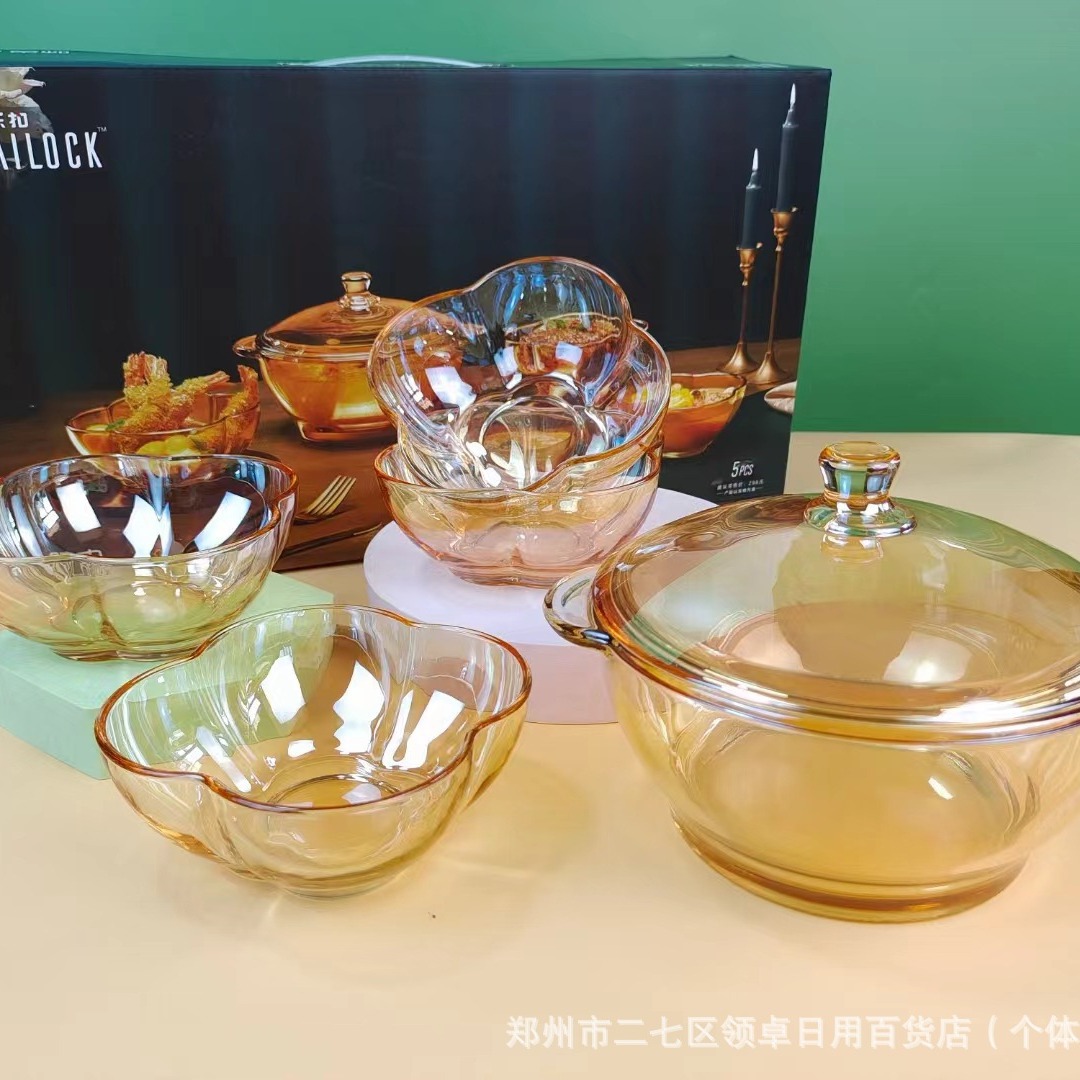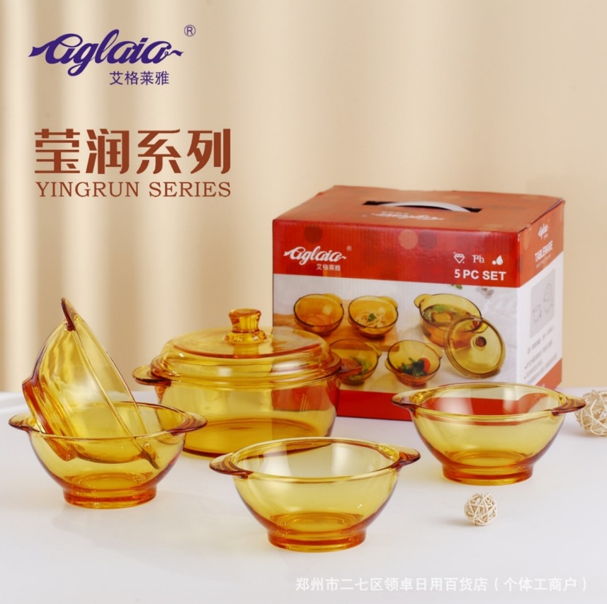 アグレヤ莹潤シリーズ琥珀色耐高低温ホウ素シリコン強化ガラス碗蓋付き鍋大礼箱セット