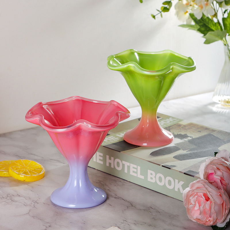 レトロなすりガラスのカラーデザートカップ夏の高足創意レースアイスクリームカップ家庭用ミルク昔冷たい飲み物カップ