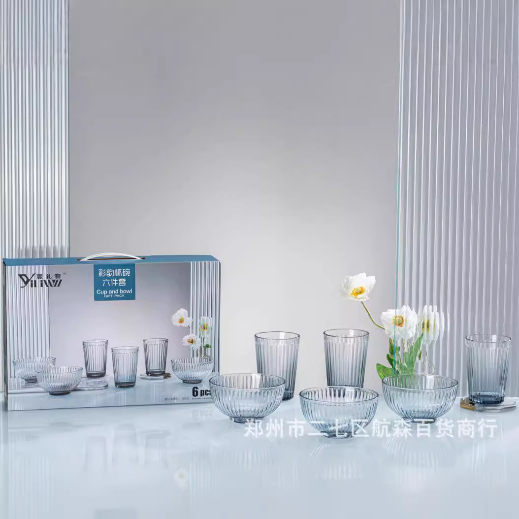 壱プレゼントシンプル彩韻カップボウル6点セット家庭用ガラス食器軽贅沢アイデアお土産ビジネスプレゼント