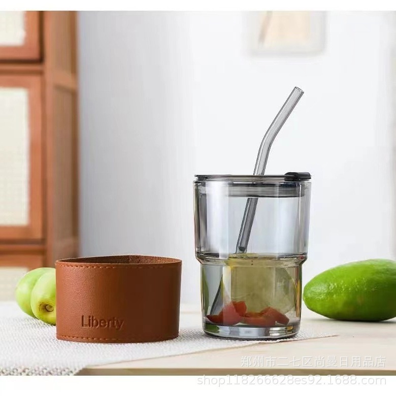 Ins竹節杯オフィスガラスコップ家庭用シンプル飲料コーヒーカップ蓋付き透明ストローネット赤カップ