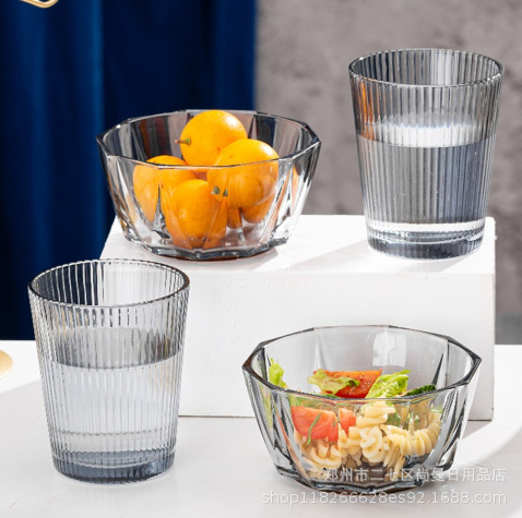 皖美之雅時ガラス縦紋軽豪華ガラスセット家庭用コップデザートサラダ碗皿