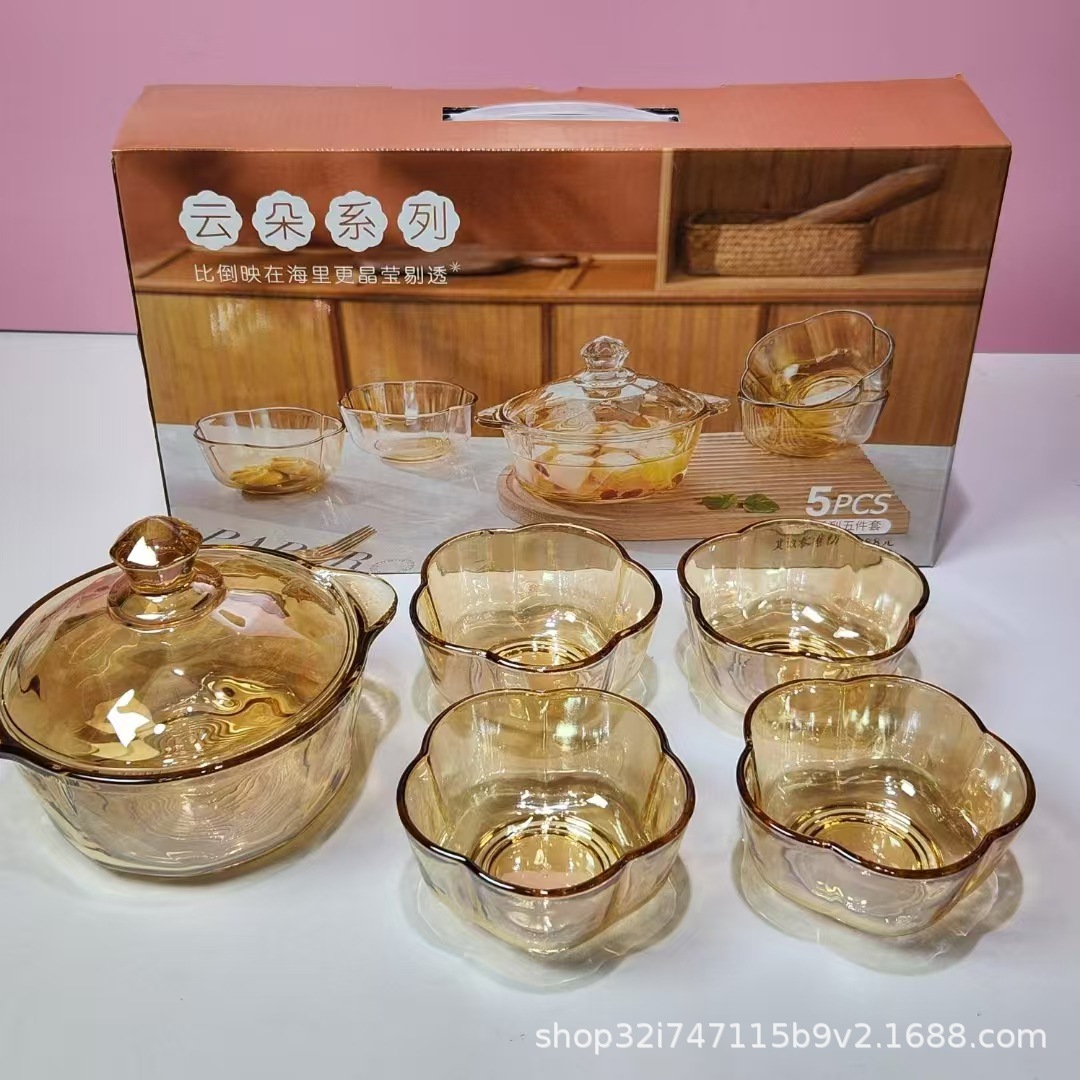 Haoliwu Yunduo ワンポット 4 ボウル 5 点セット アンバーガラスボウル 食器セット イベントギフト ZT-206