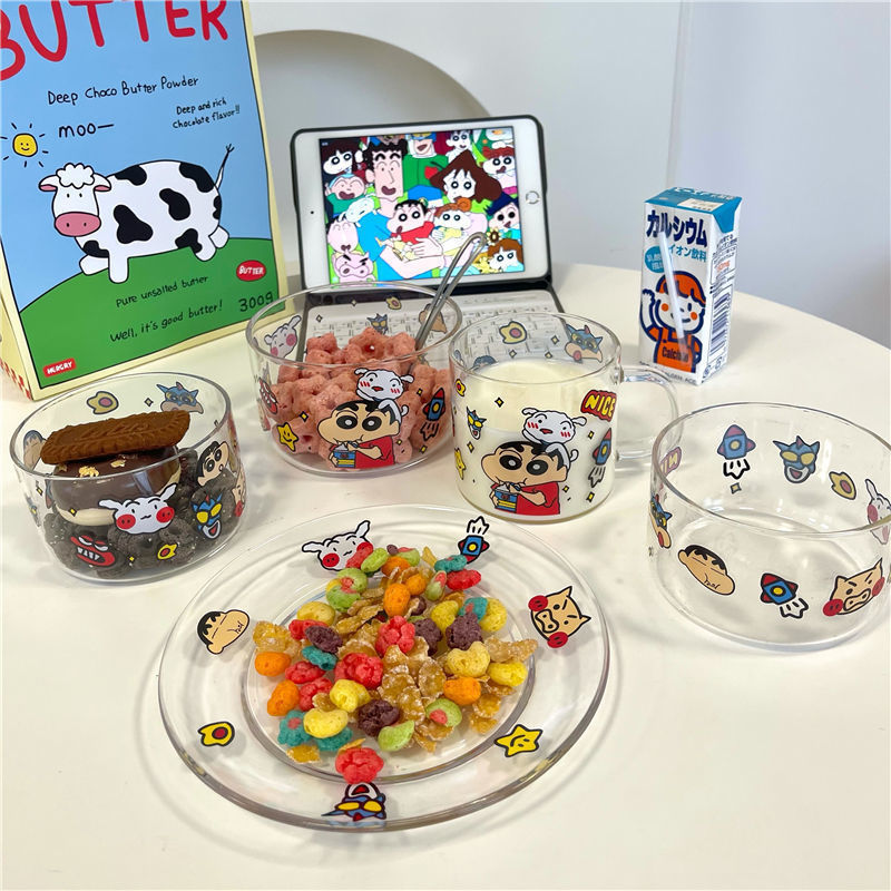 かわいいしんちゃん白童趣味高ホウ素シリコン高温サラダボウル牛乳カップデザート皿ガラス食器家庭用