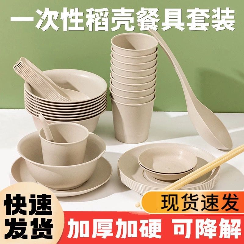 籾殻使い捨て食器セット厚手碗皿スプーン野炊飯飲食披露宴家庭用食器四点セット卸売り