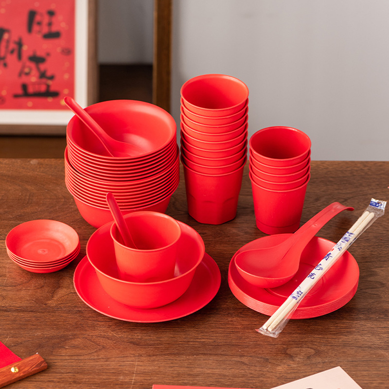 使い捨て食器の籾殻の赤い碗の皿のお祝いの茶碗の結婚の引っ越しの家庭の宴会の酒席のコップの5セット