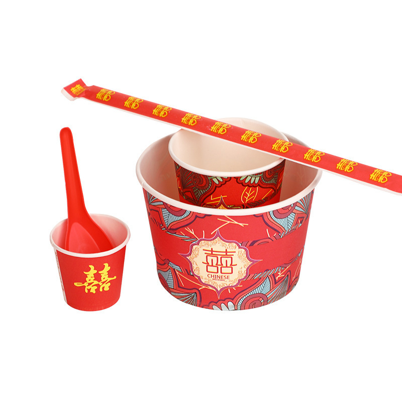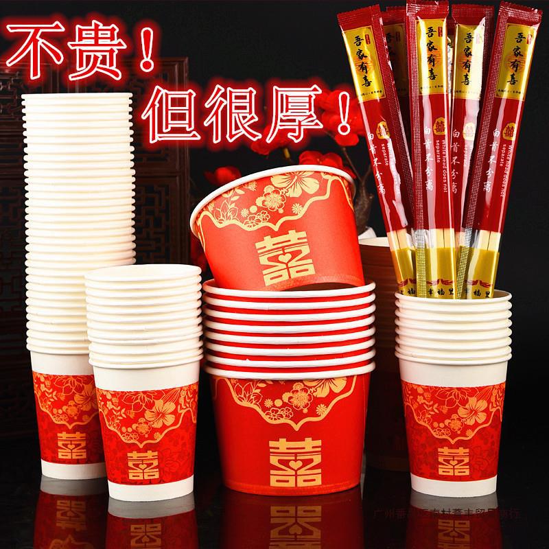 結婚の使い捨ての碗の厚い祝い事の赤い紙の碗の披露宴の酒席の食器の食器の箸のセットの結婚式の紙コップの食品級