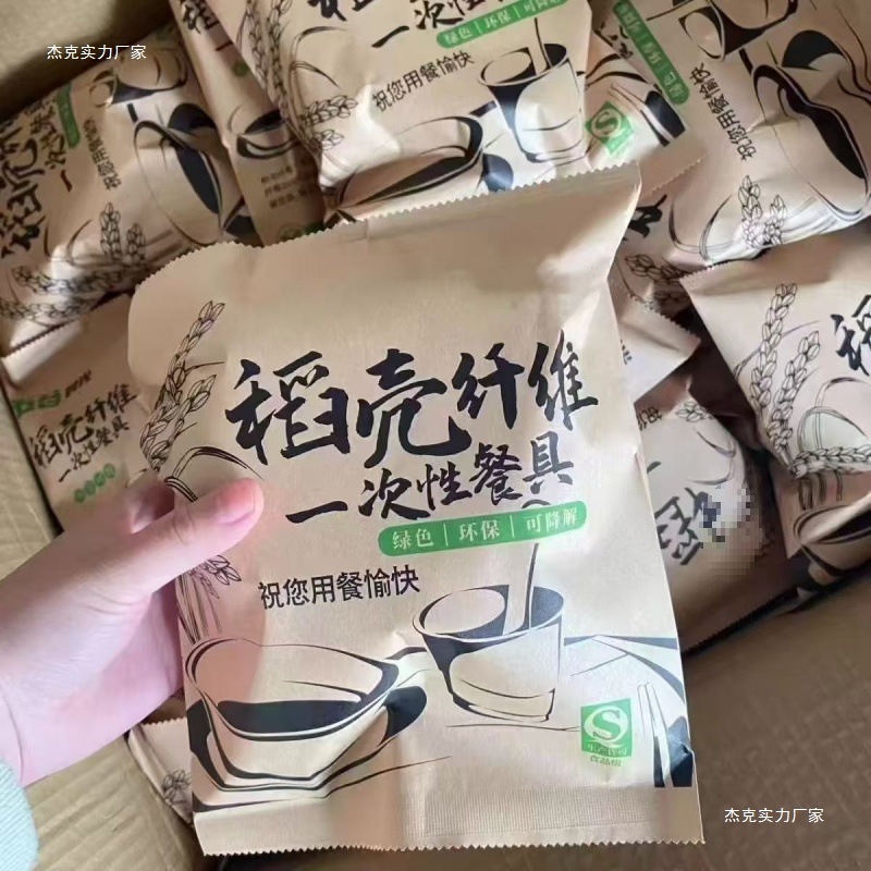 使い捨て籾殻食器セット、カップ、ボウル、箸、皿、スプーンの組み合わせ、厚みのある独立した4点セット、ホテル用ハード