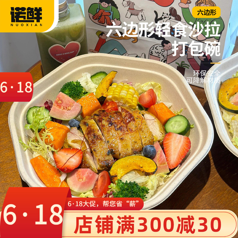 使い捨て六角ボウル、軽食サラダボウル、パルプ弁当箱、六角形テイクアウト減脂肪パスタ弁当箱