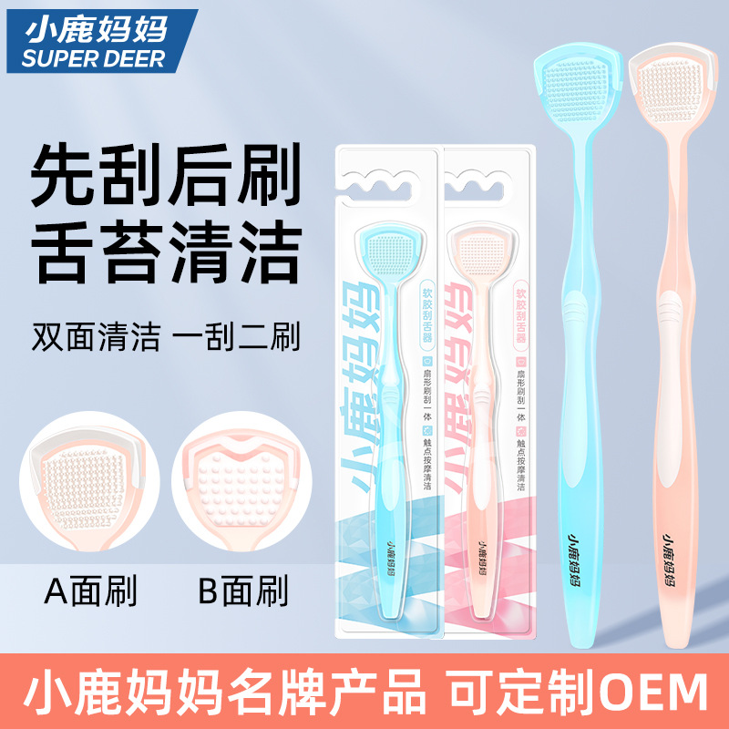 鹿のお母さんの舌の苔のクリーナーは舌の苔をこすります。