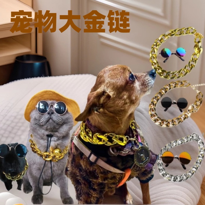 ペットネックレス、ゴールドチェーン、写真撮影用小道具、フレンチブルドッグ、犬、猫、ゴールドネックレス、メガネ、アクセサリー、個性的なジュエリー