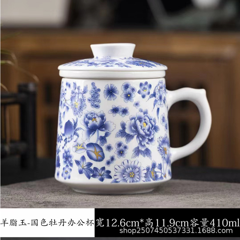 羊脂玉会議杯国色牡丹大サイズ茶杯茶水分離蓋付き大容量白磁高級マグカップ