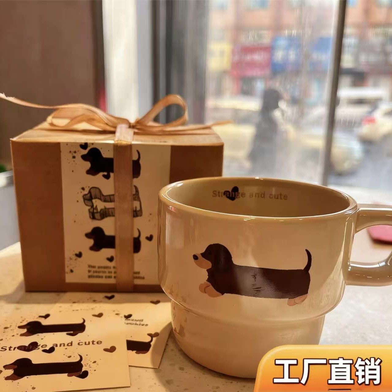 漫画風オリジナルダックスフント手描き子犬セラミックマグカップ、重ねて置ける可愛いコーヒーカップ、高颜值新作ギフト