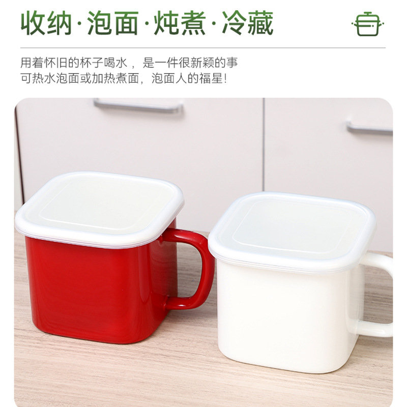 Insは墨をかけてエナメルのコップの牛乳のコーヒーの杯のレトロなヨーグルトのオート麦の果物のサラダの碗のマグカップの果物の皿をかけます。