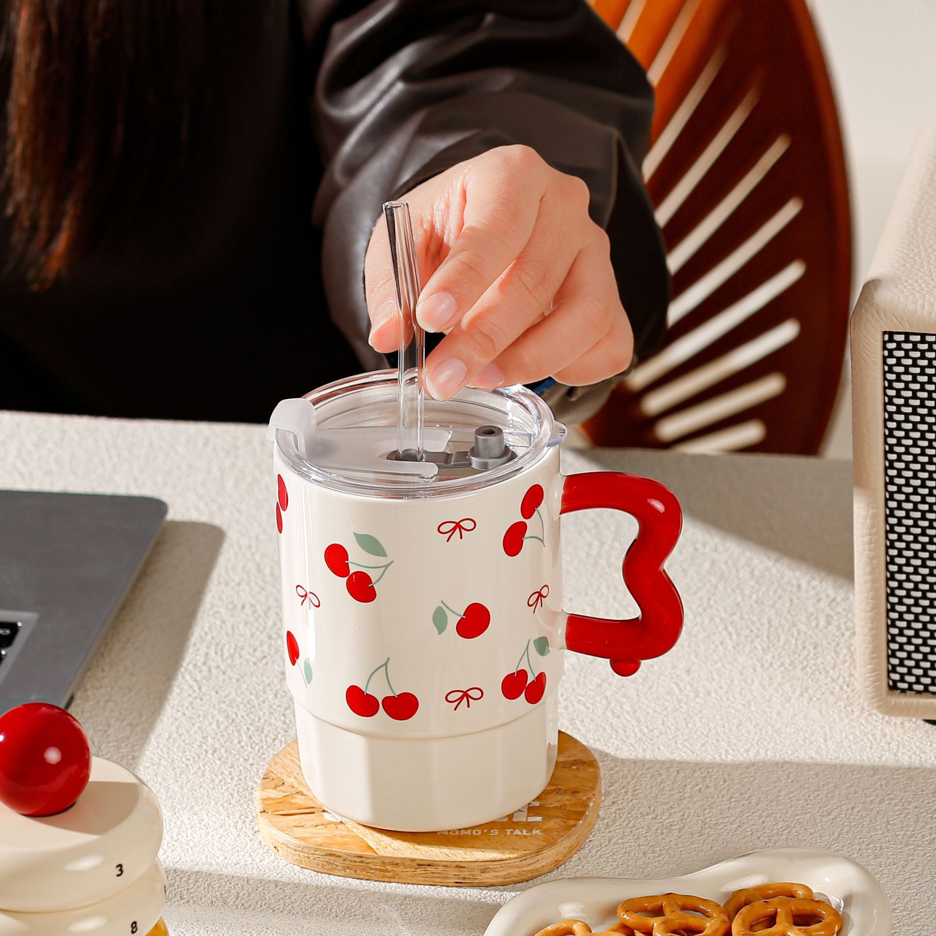 クリスマスギフト、かわいいチェリーストローカップ、蓋付き高級陶器マグカップ、誕生日プレゼント、お土産