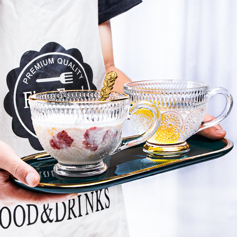レトロなレリーフ太陽花朝食カップ牛乳カップカップハンドル付き家庭用大容量プノンペンひし形グラス